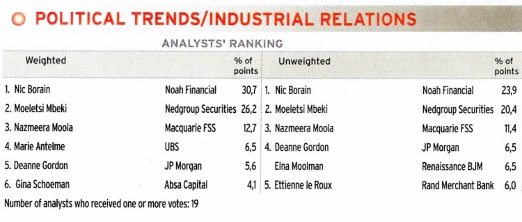 It is the last need that causes me to mention here that I was, to my great surprise, last week announced as the top ranked analyst in the Financial Mail annual Analyst of the Year Survey – in the category: Political Analysis and Industrial Relations.