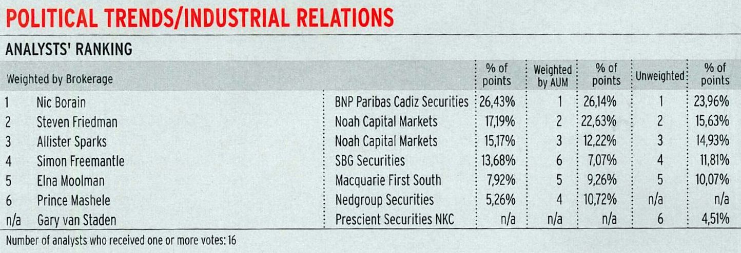 Top ranked in the Political Trends and Industrial Relations category In the Financial Mail 2014 survey