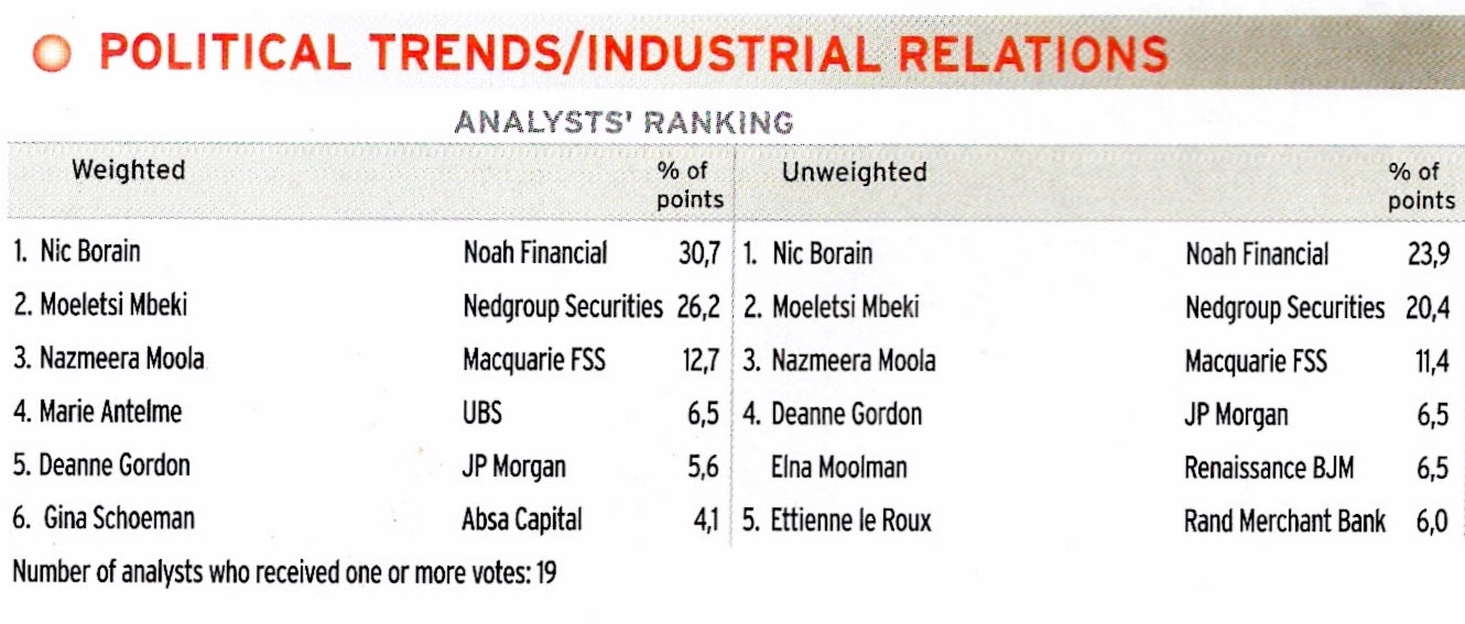 Top ranked in the Political Trends and Industrial Relations category In the Financial Mail 2014 survey