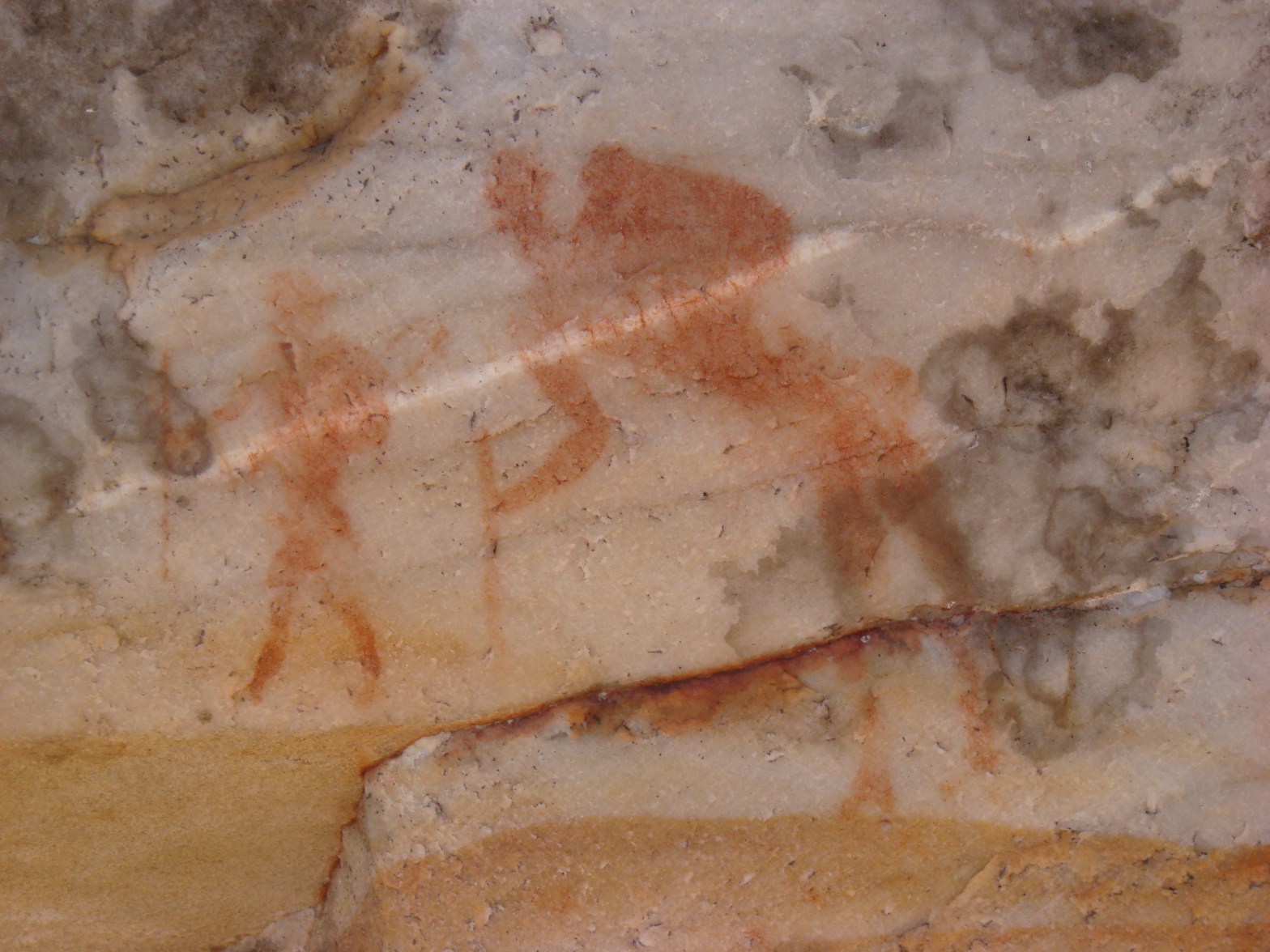 A tall woman carrying a heavy load being led by a little man – perhaps 6000 year old rock painting at Kwagga Kamma – August 10 2009